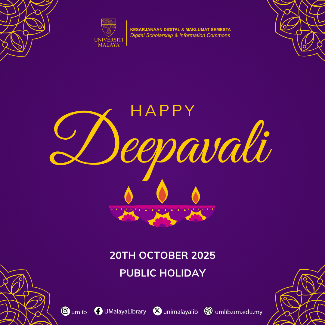 Please be informed that the Central Library will be closed on Monday (20 October 2025), in conjunction with the DEEPAVALI holiday. Library services will resume as usual on Tuesday, 21 October 2025.